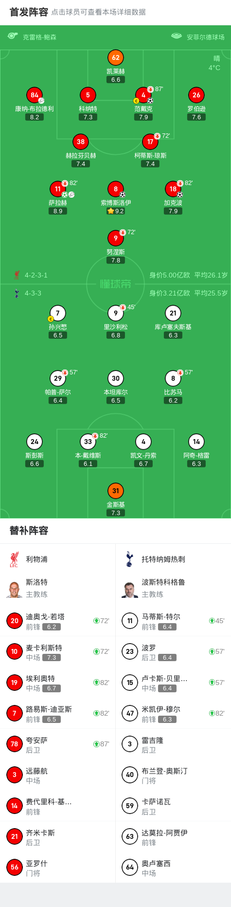 范戴克在比赛进行到第80分钟时,凭借一记头球攻门,为利物浦锁定了胜局,将比分扩大至4-0,总比分也变成了4-1。热刺队在次回合比赛中未能有所作为,最终被利物浦完全压制,无法反败为胜。