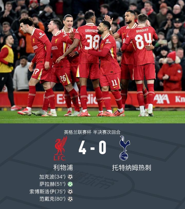 利物浦4-0大胜热刺,晋级英联杯决赛